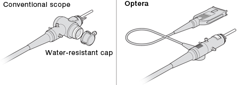 Unlike previous generations of endoscopes, Optera endoscopes do not require a water-resistant cap. This simplifies reprocessing and minimizes the risk of repair costs due to liquid ingress. The enhanced effi ciency delivered by the new waterproof connector also helps expedite procedure room setup and turnover.
