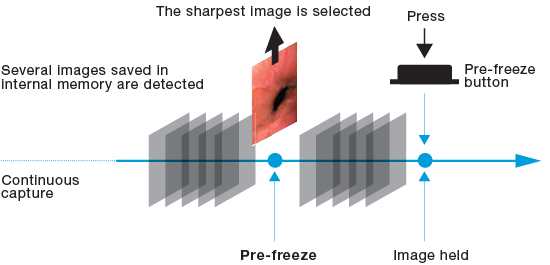 A new pre-freeze function saves time and eliminates the physician’s frustration when capturing still images. The new CV-170 automatically buffers a continuous, rapid series of procedural images. When capturing a still image, the pre-freeze function analyzes the previous images and displays and saves the sharpest image of the desired view. This function helps physicians obtain a clear visual record of the procedure in the shortest possible time.